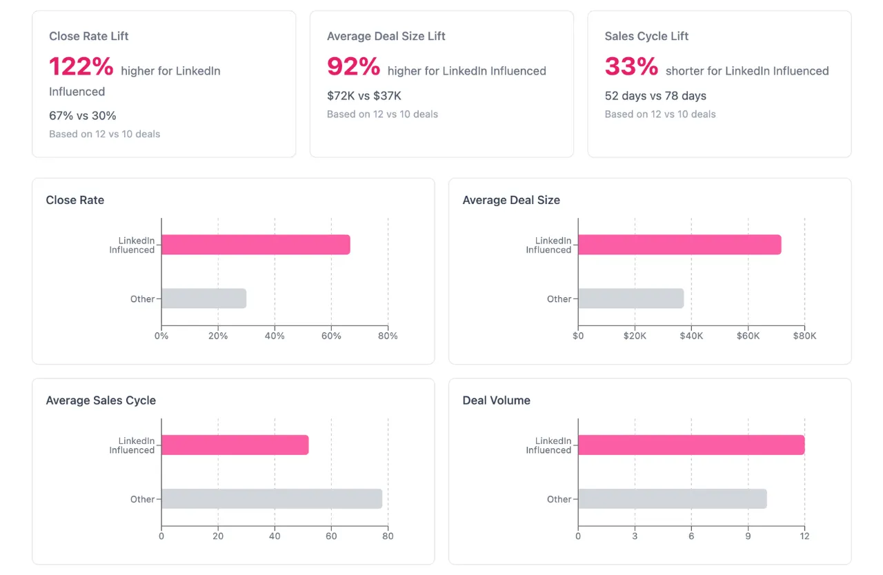 Get instant attribution insights that show how impressions and interactions from your LinkedIn Ads and organic content drive real impact on pipeline and revenue.