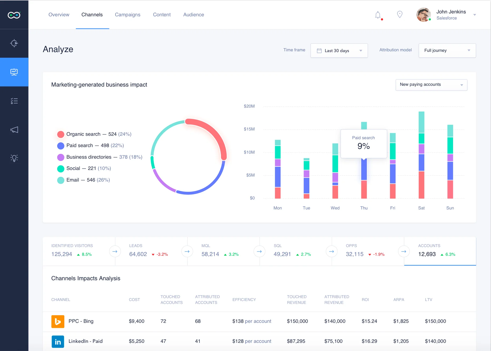 - Journey Analytics: Visualizes the complete path an account takes across different channels, campaigns, and pages.