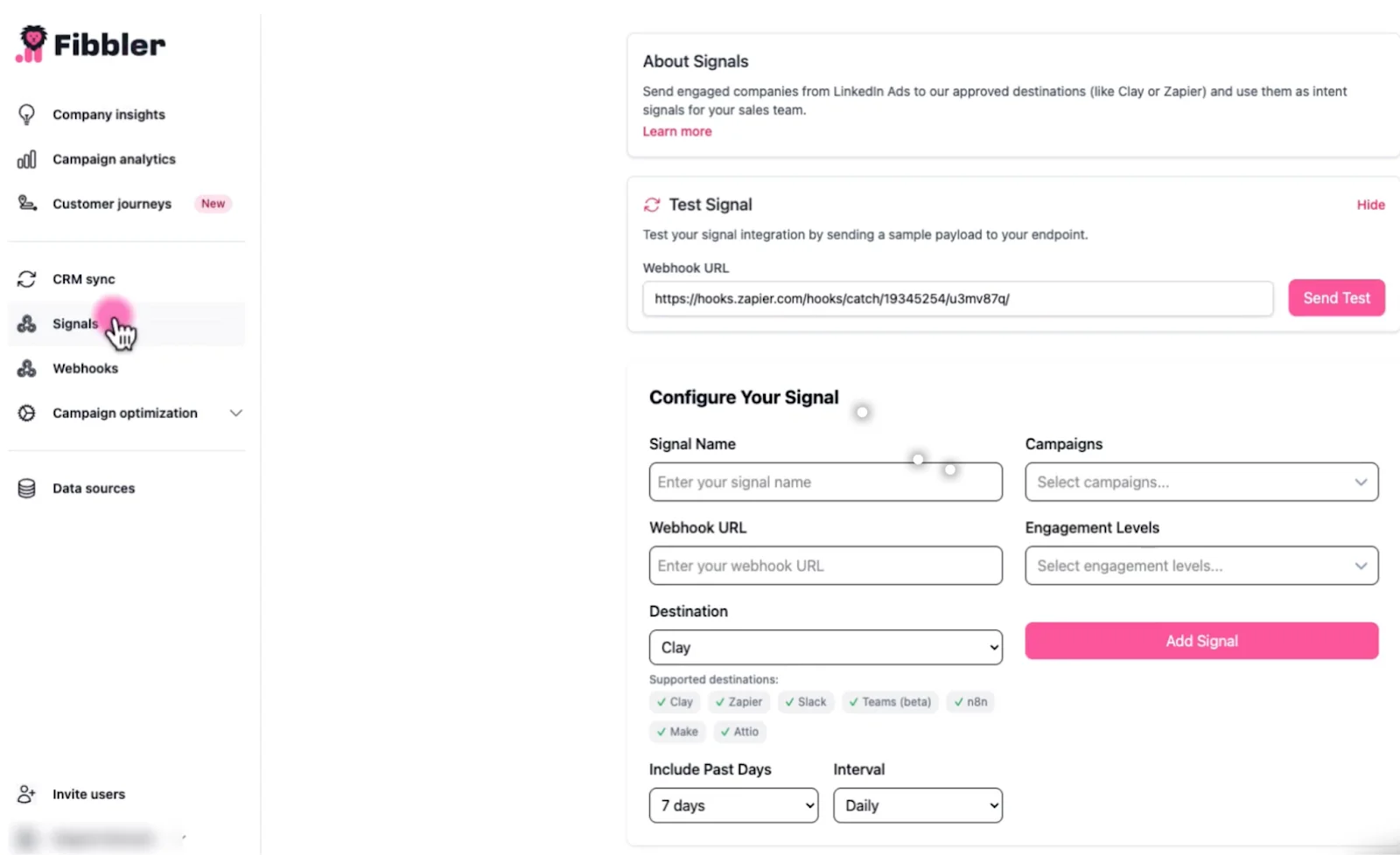 - Destination: Choose from Slack, Clay, Zapier, Make, or n8n