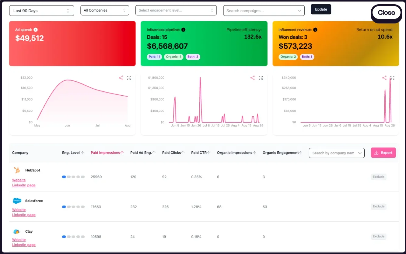 - Revenue Attribution: Connects ad engagement to real pipeline and revenue to prove campaign impact.