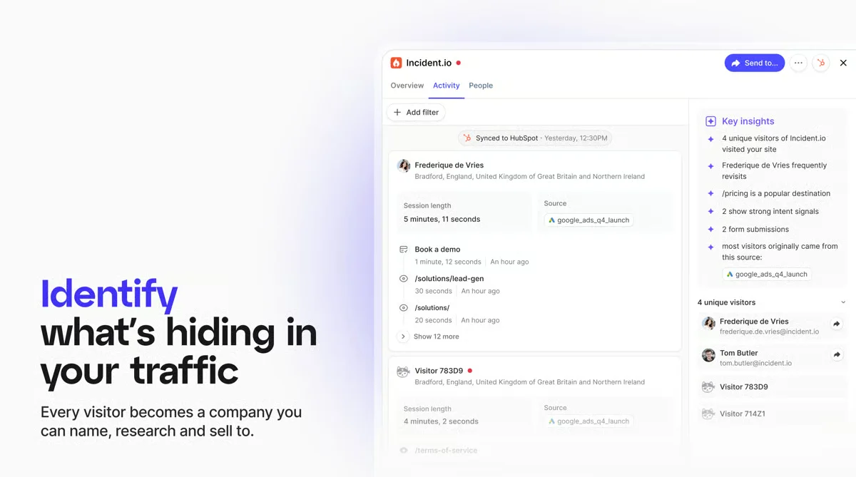 - Company-level engagement data synced to HubSpot, Salesforce, Attio, and Copper